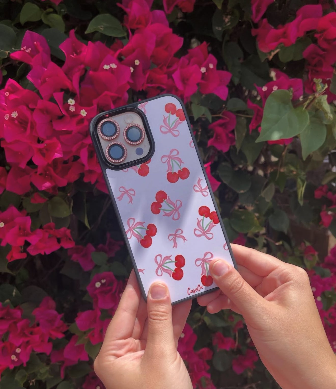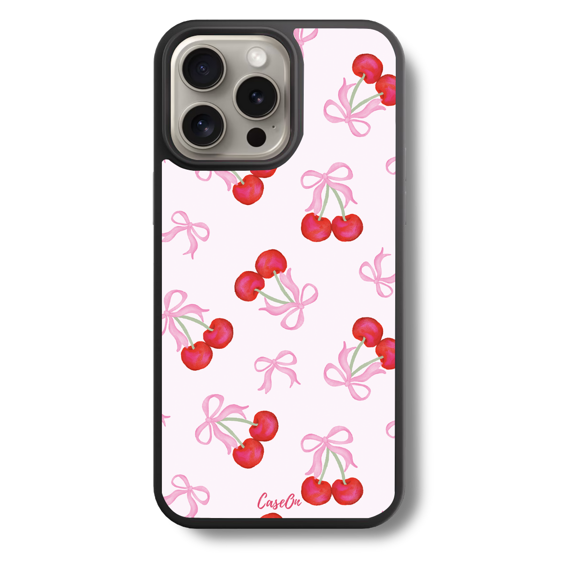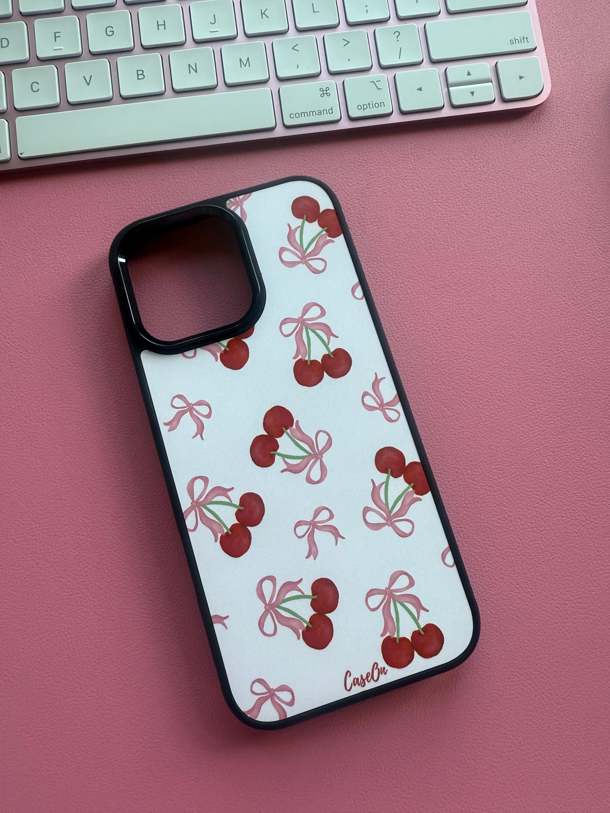 The Cherry on Top MagSafe iPhone Case by CaseOn is the perfect blend of style and functionality. Featuring a delightful design of vibrant cherries and pink bows on a pastel pink background, this case offers a playful yet sophisticated look.