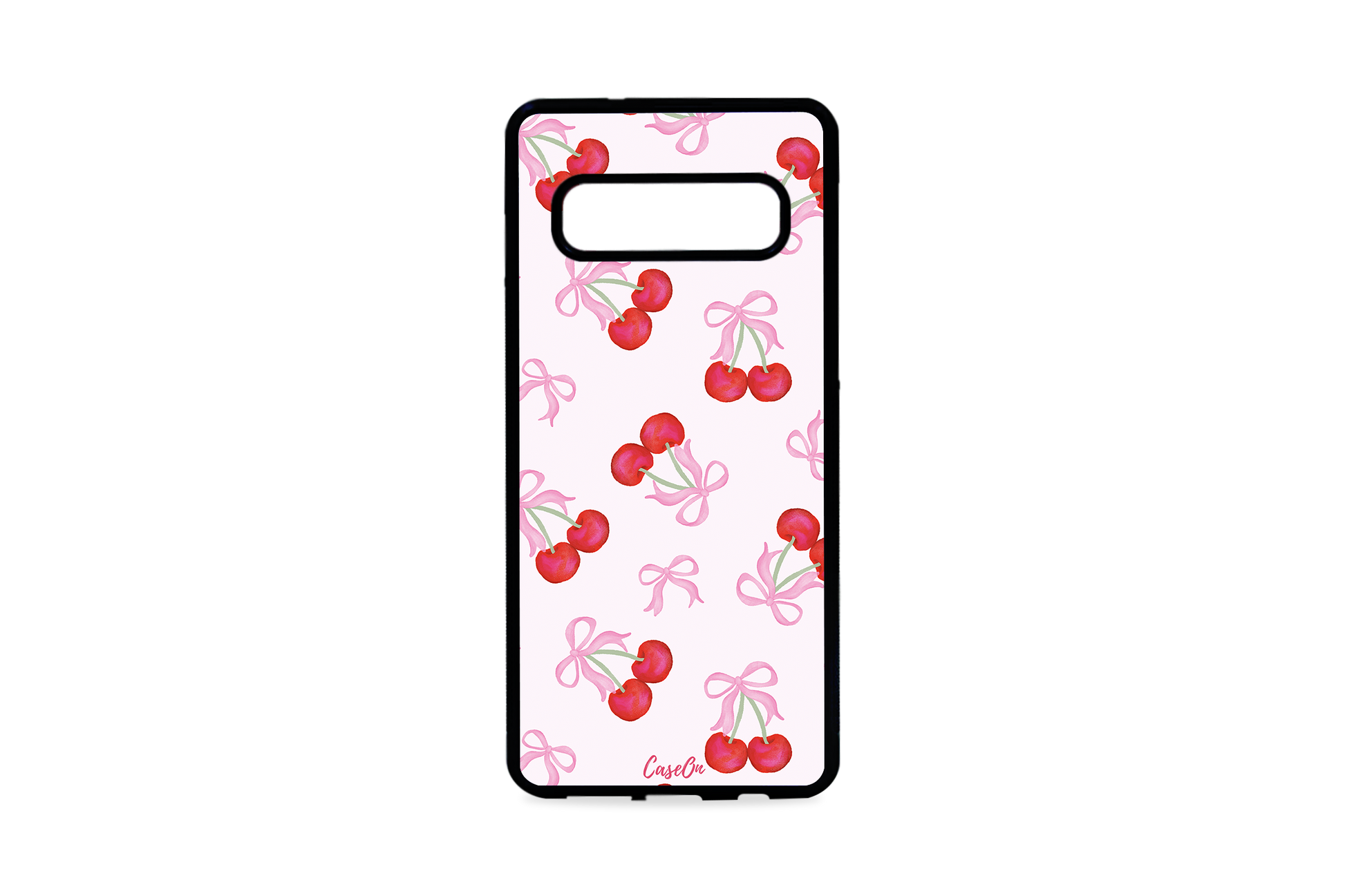Elevate your Samsung phone with the Cherry on Top Samsung Phone Case by CaseOn. This case features a delightful design of vibrant cherries and pink bows on a pastel pink background, bringing a touch of sweetness and charm to your device.
