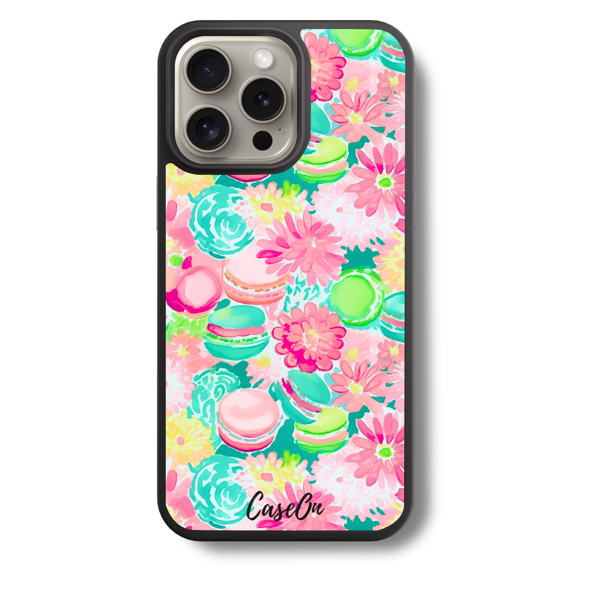 Indulge in a sweet and colorful treat with the Macarons MagSafe iPhone Case from CaseOn. This delightful design features a playful mix of vibrant macarons paired with blooming florals, creating a cheerful and whimsical aesthetic that’s perfect for dessert lovers and trendsetters alike.